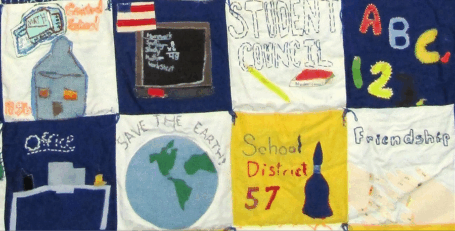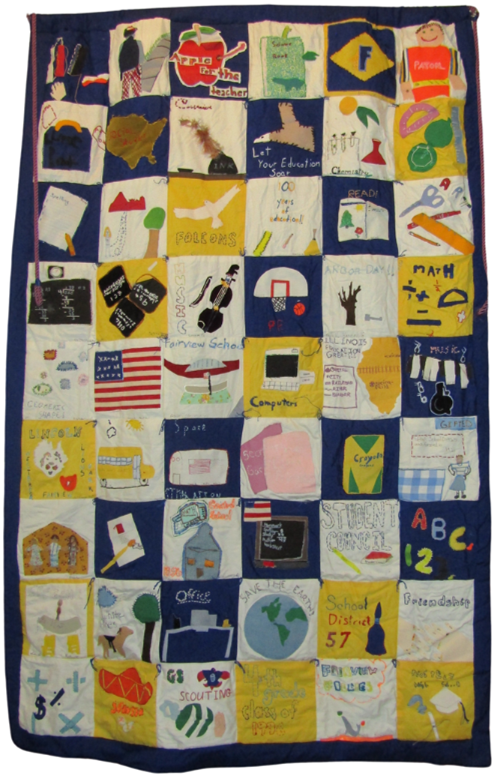 The 1996 4th grade graduating class at Fairview Elementary School created this large patchwork quilt to celebrate the 100th anniversary of the formation of Mount Prospect Public School District 57. Each of the patches was designed by a small group of 4th graders, and a parent, or possibly several parents, sewed the pieces together into the vibrant quilt.